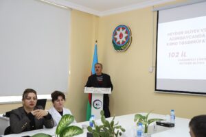 BMTBETİ-nin direktoru, professor İbrahim Cəfərov şərəfli ömür yolunu ölkəmizin tərəqqisinə və millətimizin parlaq gələcəyinə həsr etmiş Ulu Öndər Heydər Əliyevin Azərbaycan xalqı və dövləti qarşısındakı misilsiz xidmətlərindən söz açıb. Direktor bildirib ki, Heydər Əliyevin ölkəmizdə iqtisadiyyatın bütün sahələrində olduğu kimi kənd təsərrüfatı sisteminin qurulması və inkişafında müstəsna xidmətləri var. Ümummilli Lider Heydər Əliyevin Azərbaycana hakimiyyəti dövründə qəbul edilən qərarlar, hazırlanan kompleks tədbirlər planı aqrar sahədə dayanıqlı inkişafın təməl prinsiplərini formalaşdırıb. Ulu Öndər Heydər Əliyevin müəyyən etdiyi uzaqgörən siyasət, məqsəd, vəzifə və prinsiplərə əsaslanan sosial-iqtisadi siyasət hazırda Azərbaycan Respublikasının Prezidenti cənab İlham Əliyevin rəhbərliyi altında uğurla davam etdirilir.